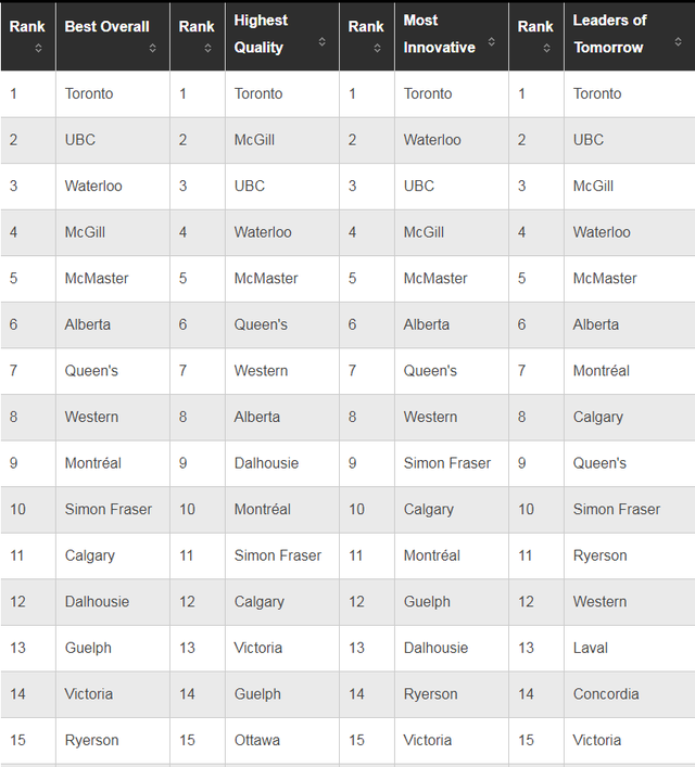 这是多伦多大学第六年蝉联加拿大最具声誉大学榜首。以下是排名全加拿大前15的大学: