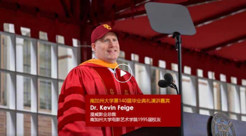 毕业生们,不管在前面等待你们的是什么,享受你们在成为“英雄”旅程中的每一步!拥抱你的缺点,将它们转化为优势。学会接纳失败,在跌倒后重新站起来,面对挑战迎难而上、坚持不懈。记住你在USC学到的东西:适应、克服、合作。因为拥有一个可靠的团队太重要了。通常来说,每部电影的制作都不是一个突发奇想,而是团队一起努力,不断思维碰撞的结果。大家一起把糟糕的东西变得好一些,再好一些,最终才能成为人们愿意不断回味的作品。我相信人类生来具有团队合作的本能。而合作无疑是漫威成功的关键。所以你们要和南加大的伙伴保持联系,交换想法,同时也要不断寻找能给你带来挑战的新的合作者。