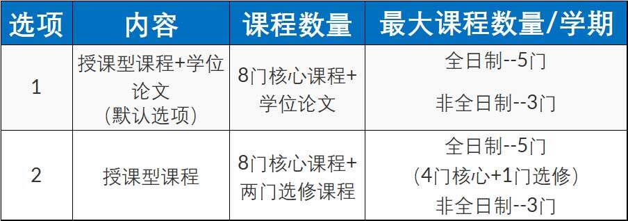 所有学生将自动分配默认选项1 – 授课和论文相结合的修课模式,如希望申请选项2 – 纯授课型修课模式,则须使用“学习选项转换申请表”进行正式书面申请。
