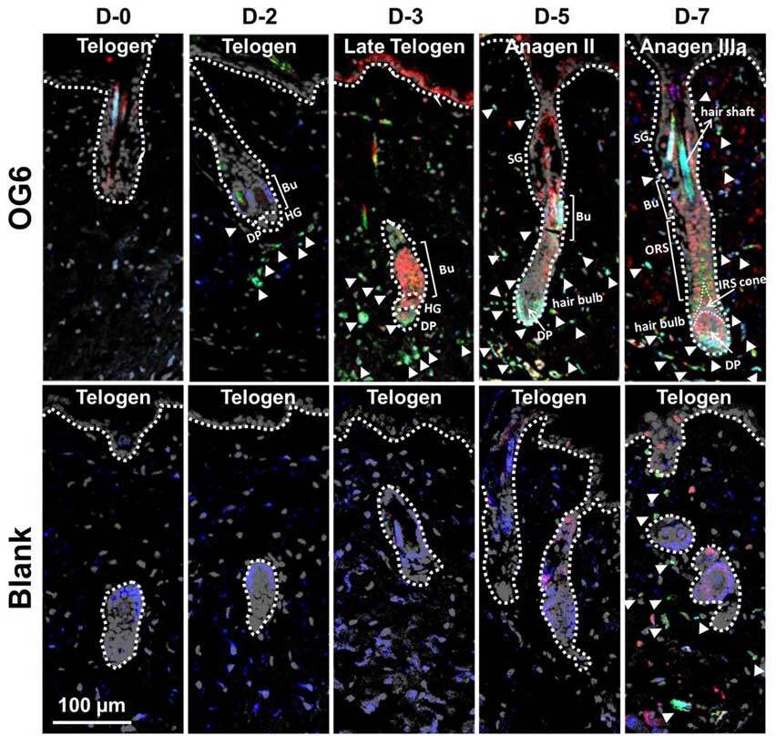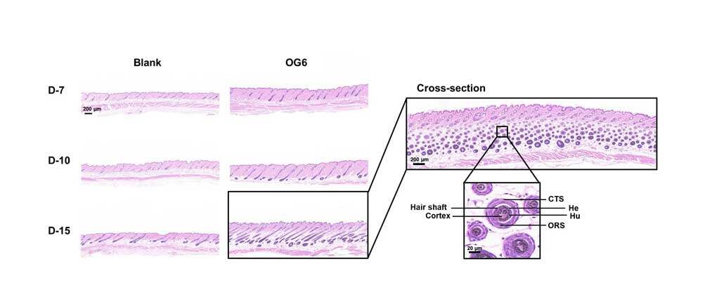 王春明表示,哺乳动物的毛发从毛囊中长出,其生长具有周期性,从静止期到生长期的转变受局部组织的生理微环境调控。毛囊附近某类免疫细胞数量或某类细胞因子浓度的变化,都可能刺激毛囊生长,但这些变化难以精准控制。在该研究中,团队优选出一种“纤维素酶”,如同剪刀一般,可将天然药物蒟蒻来源的葡甘聚糖,从非常大的分子“剪”成比较小的分子片段。从一系列比较小的片段中,研究人员找到一个代号为OG6的寡糖组分,可以精确诱导皮肤中的特定细胞释放一种名为“趋化因子”的信号(CCL5)。