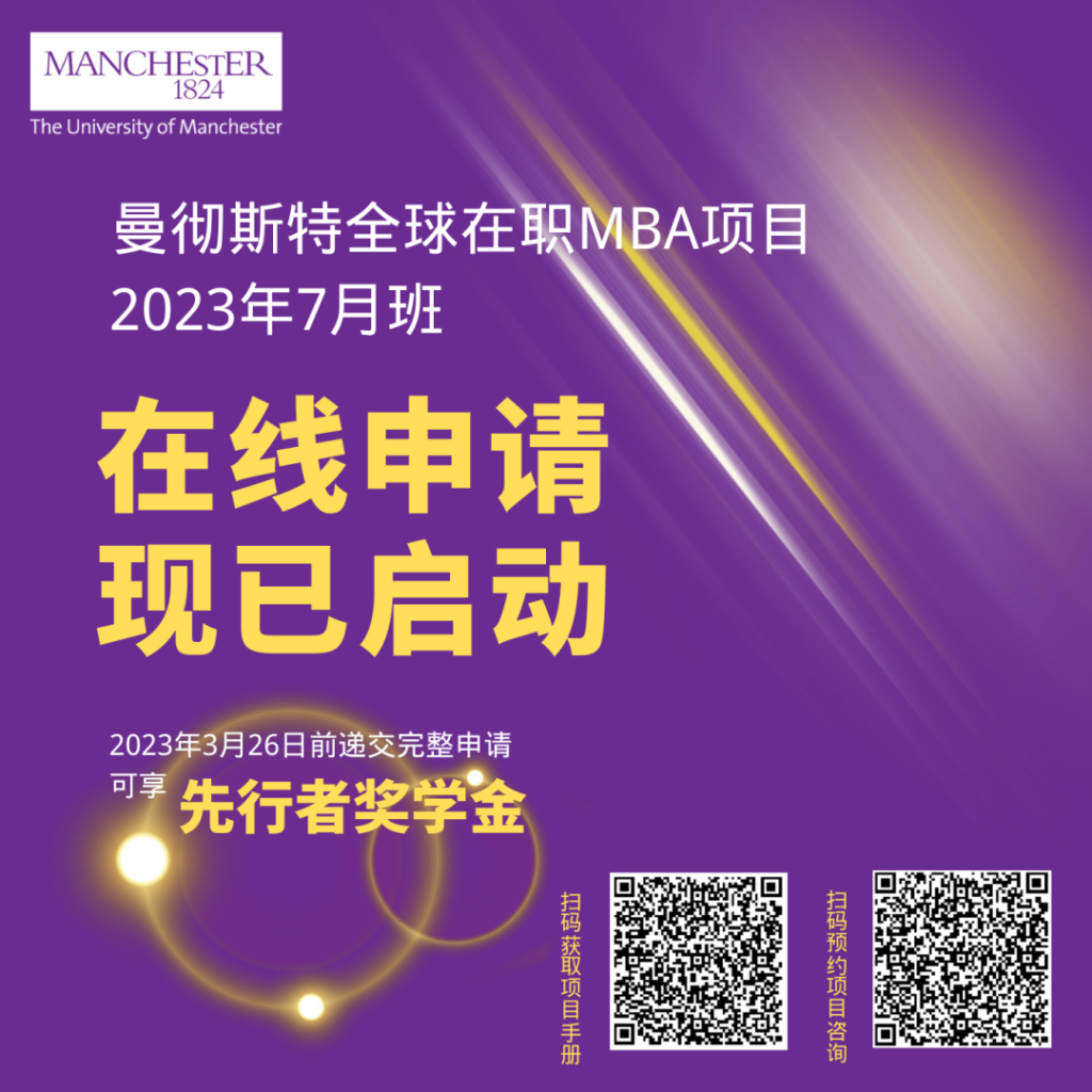 曼彻斯特大学全球在职MBA 2023年7月班在线申请现已开启。无联考申请制入学,两年在职学习,获得与曼彻斯特大学全日制MBA一致学位证书。全英文授课无需脱产出国,兼顾工作、学习和生活。点击下图查看项目详情: