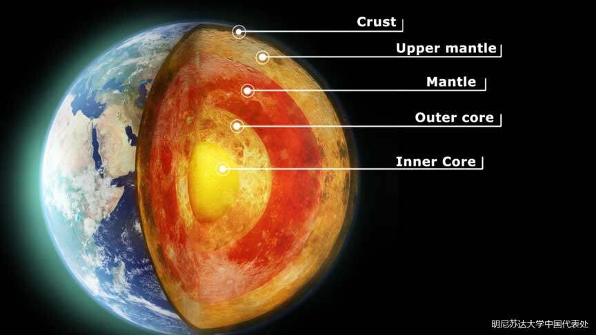 在地球的内部结构中,地壳(Crust)好似一层薄薄的小斗篷,仅占地球体积的1%左右。其下方是地幔(Mantle),约占85%的地球体积,主要物质成分是铁镁硅酸盐类,呈固态。