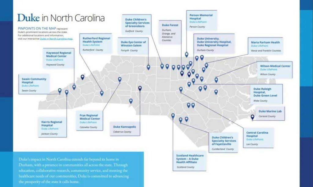 通过教育、合作研究、目的明确的伙伴关系、服务以及满足社区的医疗需求,杜克大学致力于促进被它称为家的北卡州的繁荣。第二年的《杜克大学在北卡罗来纳州的影响力和参与度年度报告》通过着重强调杜克大学、杜克健康和杜克 LifePoint 医疗在北卡罗来纳州的价值、存在和影响,凸显了杜克大学做出的贡献。