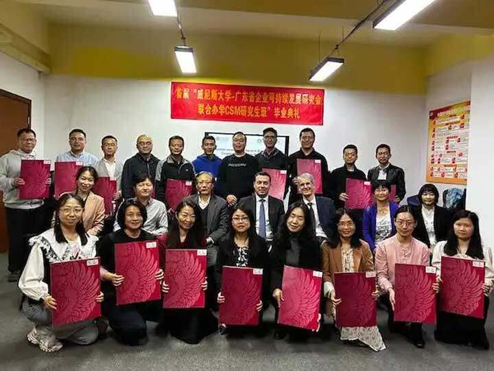 4月2日,企业可持续管理硕士课程在中国广州颁发了首批学位证书:本初级专业硕士课程由威尼斯大学挑战学院与广东省企业可持续发展研究会联合发起,第一届招收的19名学员为大型跨国公司的中国区职员,他们就职于新百伦、亚马逊、安利、上海波音航空服务有限公司等。