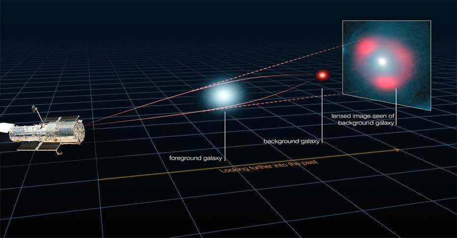 暗物质既不会发光,亦不会吸收或反射光,因而难以运用传统的天文学技术来观测。如今,天体物理学家用以研究暗物质的最佳方法,是通过爱因斯坦在广义相对论中预测的引力透镜现象。在这个理论中,质量会扭曲时空,使得光线在质量巨大的物体如恒星、星系或星系团的周围弯曲。通过观察这种光的弯曲,科学家们可以推断出暗物质的存在和分布,以及正如本研究所证明的那样,推断出暗物质本身的性质。如图一所示,当前景透镜物体和背景物体(两者各自都是单独的星系)对齐时,我们便可以在天空看到多幅相同背景物体的影像。其中多重成像的位置和亮度,取决于前景透镜物体的暗物质分布,因此引力透镜为探测暗物质提供了一个非常有力的方法。
