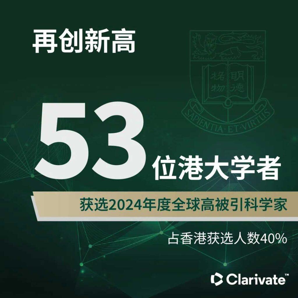 全球新闻头条新闻 53名香港大学学者入选科睿唯安的“2024年度全球高被引科学家”名单 编辑 陈思学 - 2024年11月23日 香港大学共有53名学者入选科睿唯安今日公布的“2024年度全球高被引科学家”名单,入选学者数目创历年新高,为香港院校中最多,占香港入选学者人数40%,并在全球众院校和科研机构中名列第10位,凸显了港大研究团队的卓越以及对全球的影响力。 港大再创佳绩,令香港继续名列全球拥有最多“全球高被引科学家”的十大地区和国家。
