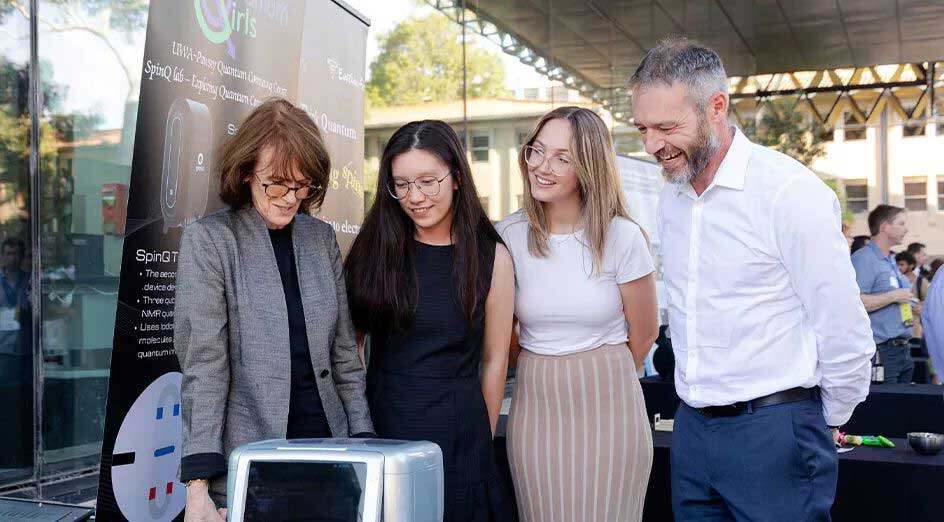 图片:澳大利亚首席科学家Cathy Foley博士、西澳大学本科学生Nicole Yong、Julia Celiberti和西澳大学Vince Wallace教授与西澳大学用于教学的便捷量子计算机(SpinQ Triangulum)合影。