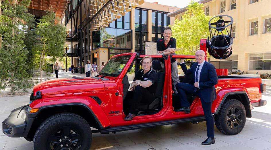 图片:国际射电天文研究中心(International Centre of Radio Astronomy Research ,ICRAR)西澳大学站点的David Gozzard博士、Sascha Schediwy博士和Dawson部长与ICRAR移动光学地面站(红色吉普车)合影,ICRAR移动光学地面站是TeraNet光学通信项目的关键部分(包括量子通信研究)。