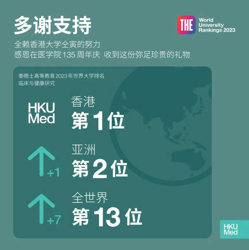 在最新公布的2023年《泰晤士高等教育》世界大学「临床与健康研究」(Clinical & Health)排名中,港大医学院荣登第13位,较去年的第20位提升七位,连续两年刷新纪录。