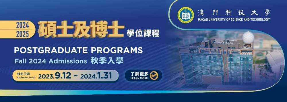 澳门科技大学研究生课程2024学年秋季入学于2023年9月12日开始接受申请。我们期待与优秀人才共创卓越,欢迎有意修读硕士或博士学位课程者报名。