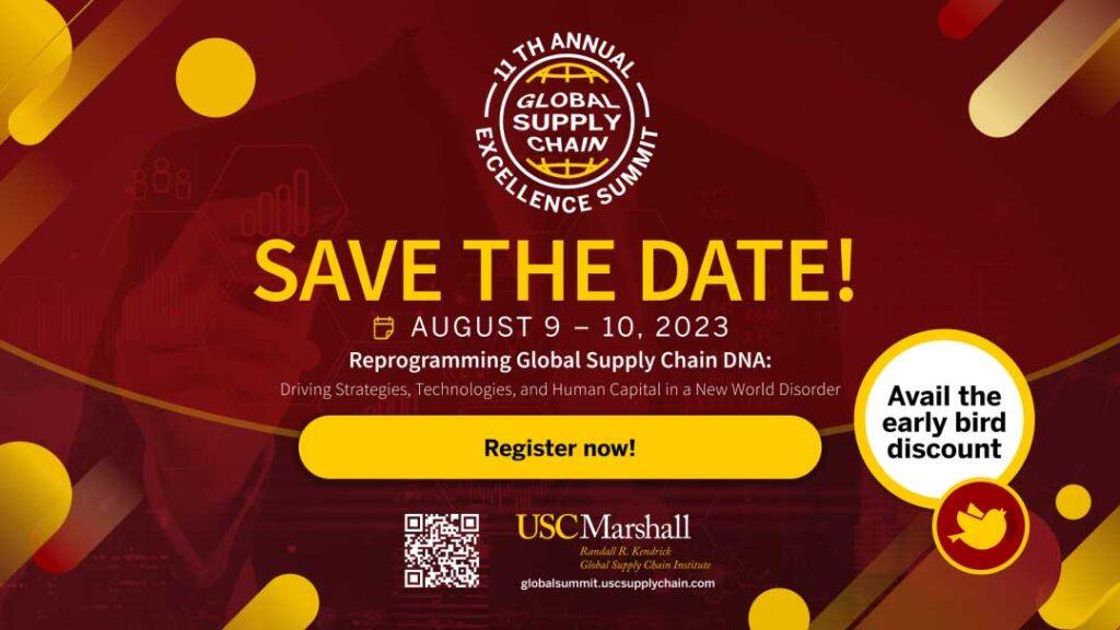 2023年8月9日至10日,第11届年度全球供应链卓越峰会(Annual Global Supply Chain Excellence Summit) 将由USC Marshall Randall R. Kendrick全球供应链研究所在南加州大学校园举办。