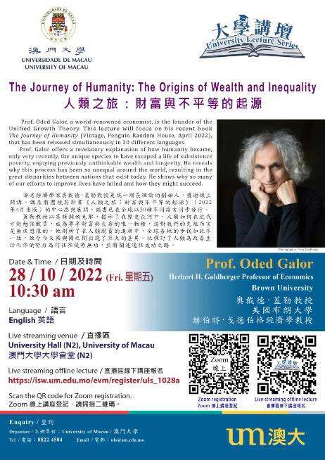 澳门大学将于10月28日(星期五)举办“大学讲坛”讲座,由著名经济学家奥戴德·盖勒(Oded Galor)担任讲者,以“人类之旅:财富与不平等的起源”为题发表演说,探讨人类文明数项重大课题,如发展、贫穷、增长、财富、不平等之间的关系。讲座将线上线下同步举行,欢迎有兴趣人士参加。