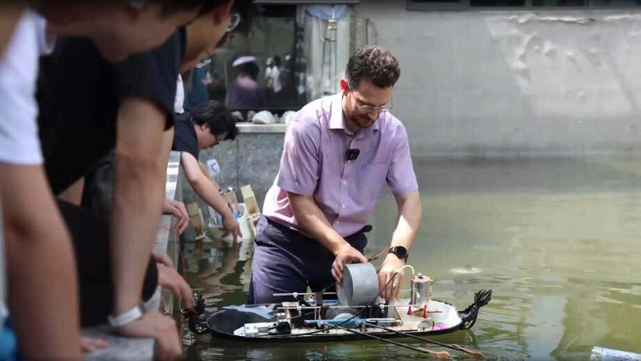 哗——!课程负责人、材料与制造副教授Adam Rushworth卷起裤腿、换上拖鞋,一个箭步跃入水池中,开始观测由学生打造的小船。