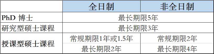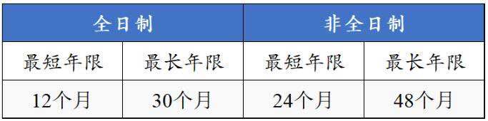 该课程提供全日制和非全日制两种研修方式,最短和最长毕业期限如下表所示: