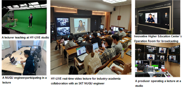 汉阳大学在世界上首次推出了利用远程呈现(Telepresence)技术,在远处的另一个教室也可以进行双向授课的HY-LIVE讲座,以此提出了新的教育革新事例。”HY-LIVE”是利用结合显示技术(AR/VR/MR)和互联网技术的5G远程呈现视频会议系统使人产生一种实际对方在面前的错觉的,实现全息线下授课和在线授课并行的全新的授课方式。