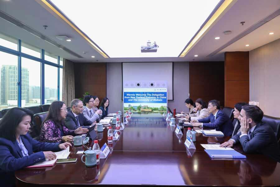 近日,新西兰驻华大使馆教育参赞、新西兰教育国际推广局大中华区主任张典(Michael Zhang),新西兰怀卡托大学资深常务副校长阿利斯特▪琼斯(Alister Jones)一行到访浙大城市学院。校长罗卫东会见了代表团一行,双方就进一步加强教育合作和文化交流进行会谈。